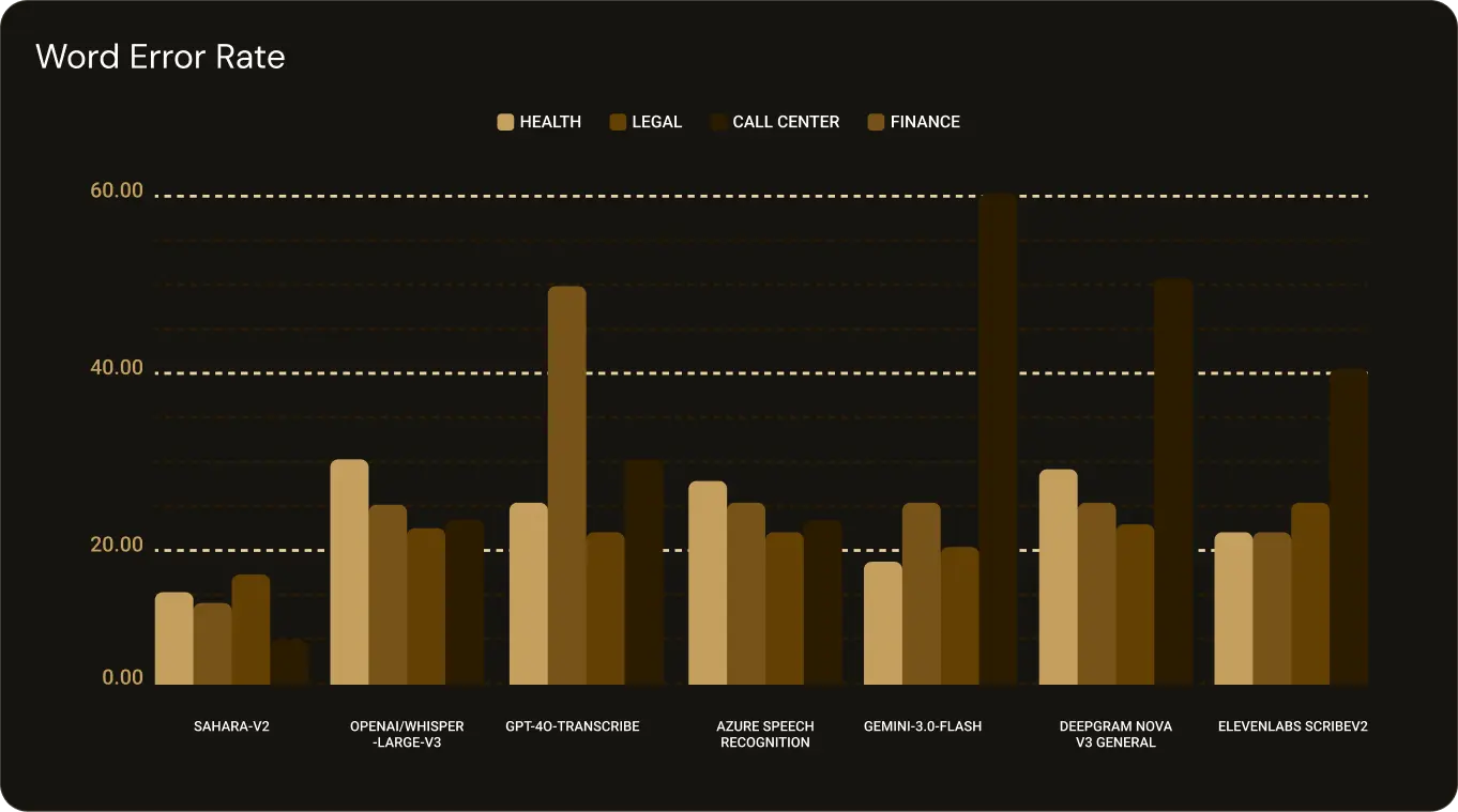 Sahara-v2 consistently outperforms leading global speech models, including Gemini-3, Meta Omni-language ASR, Azure, Whisper, GPT-4 Audio, Deepgram, and ElevenLabs.